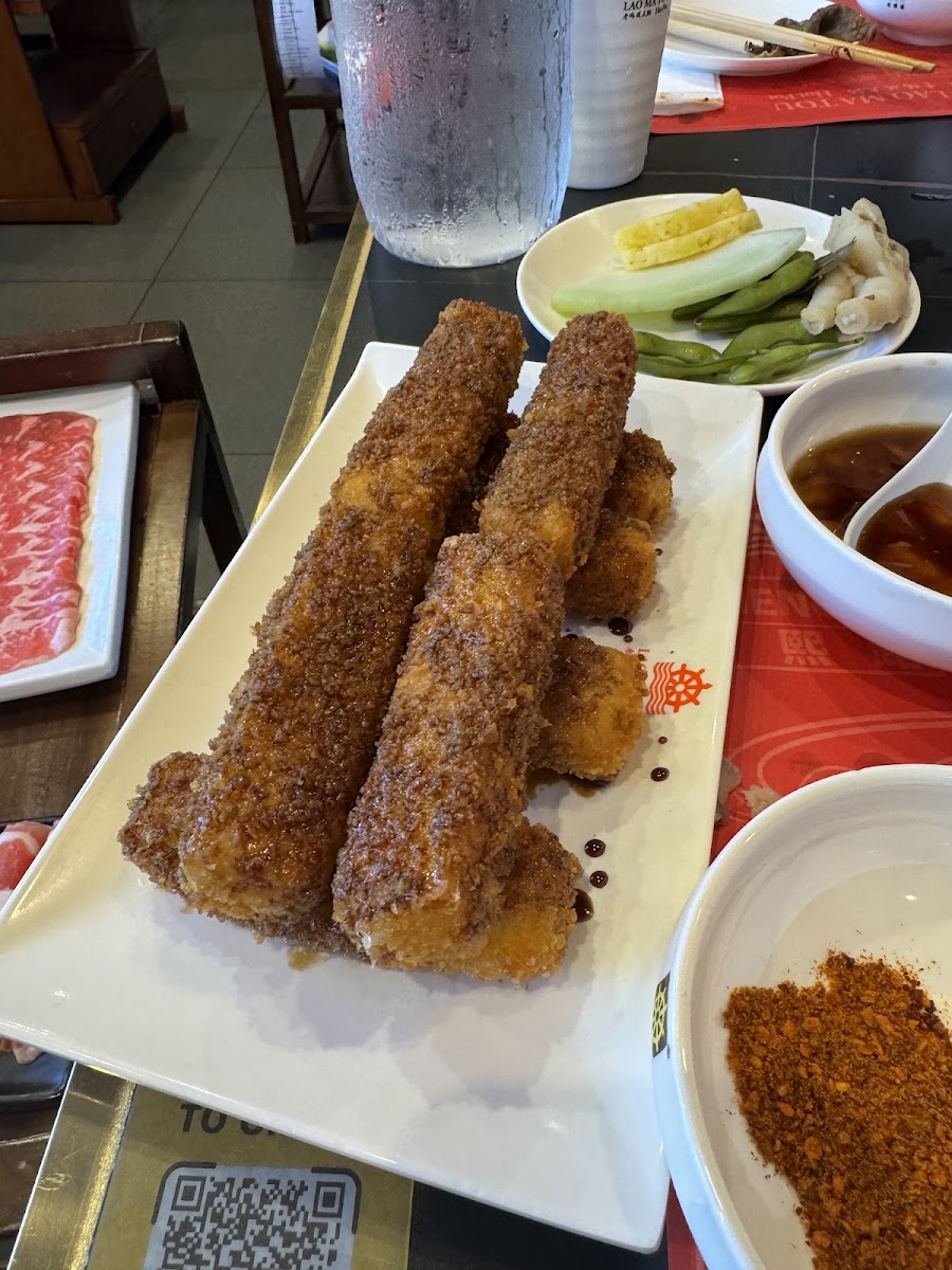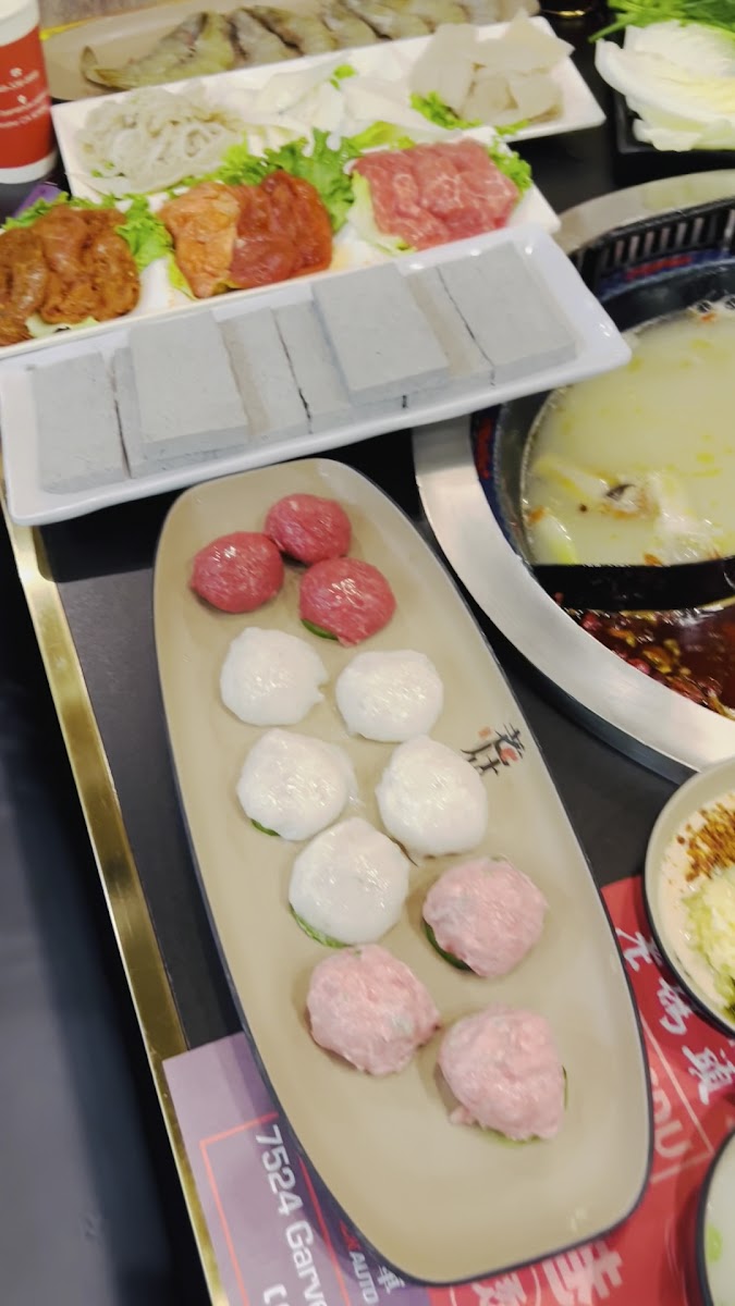 We came in on a weekday for lunch. Located in a strip mall on Barranca, parking can be quite difficult during certain hours since there are so many businesses in the area. Parking spaces can also be a bit tight for larger vehicles. Restaurant is nicely decorated with indoor dining areas, private rooms, as well as outdoor areas. With this type of hot pot, wear light clothing as it will make all your clothes smell like it afterwards. Staff is friendly and attentive. It's definitely pricey for the quality of food you get, but it was a fine experience. There's an open bar area to make dipping sauces and a variety of snacks from edamame, red bean paste balls, and desserts, but I think if you don't purchase the combo, it's an additional cost Food wise, they have a mix of combos or a ala carte items. We ended up getting the four person combo and rib eye ala carte. While the combo is a lot of food and variety, I find it lacking meat options. It's a mix of one choice of meat, veggies mix, mushroom mix, meatball variety, tofu, and an "appetizer" (we got crispy pork), fish plate, and a beef/egg plate. Also a pitcher of plum or orange juice and rice and/or noodles. It's a lot and definitely worth it if you're looking for a nice spread, but for someone like myself, I'd rather just plates of meats, veggie/mushroom plate, and the crispy pork to eat. Meat quality is good, not amazing. The broths are good, though I did find the bone broth lacking flavor a bit. The spicy broth, we got level 3 (1-5) and it was good. It's enough heat while not making you suffer. If you're hesistant, maybe go with a lower spice level or ask them to add more plain broth to it after. I love that mala spice so it's a good choice. It's one of those places I did enjoy. Would I come back often probably not, but I would come back as it's a pleasant dining experience.